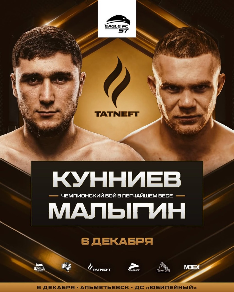 🦅Хабиб организует мощные бои в Татарстане: кард в Альметьевске будет очень жестким. 6 декабря в Татарстане пройдет турнир лиги EAGLE FC 57, где зрители увидят яркие поединки молодых проспектов по правилам ММА. 🏆 Кунни Куниев vs Вадим Малыгин - титульный поединок в легчайшем весе; 🥊 Октябрин Яковлев vs Даниил Кулицкий; 🥊Далгат Зубаиров vs Магомед Гапизов; 🥊Гасан-Гусейн Расулов vs Махмуд Абдулатипов; 🥊Шахбан Гапизов vs Моххамад Сепахванд; 👍Поддержи наш канал cвоим голосом 📺Смотрим бои в прямом эфире ⚡ @teleudar