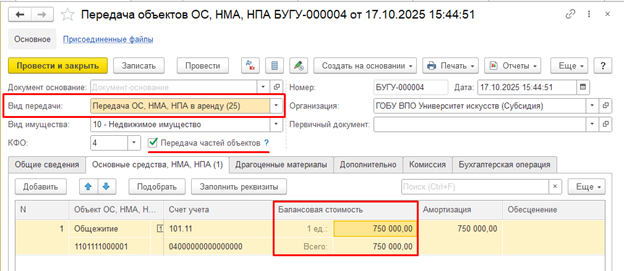 Как в 1С:БГУ отразить передачу в аренду части объекта основных средств