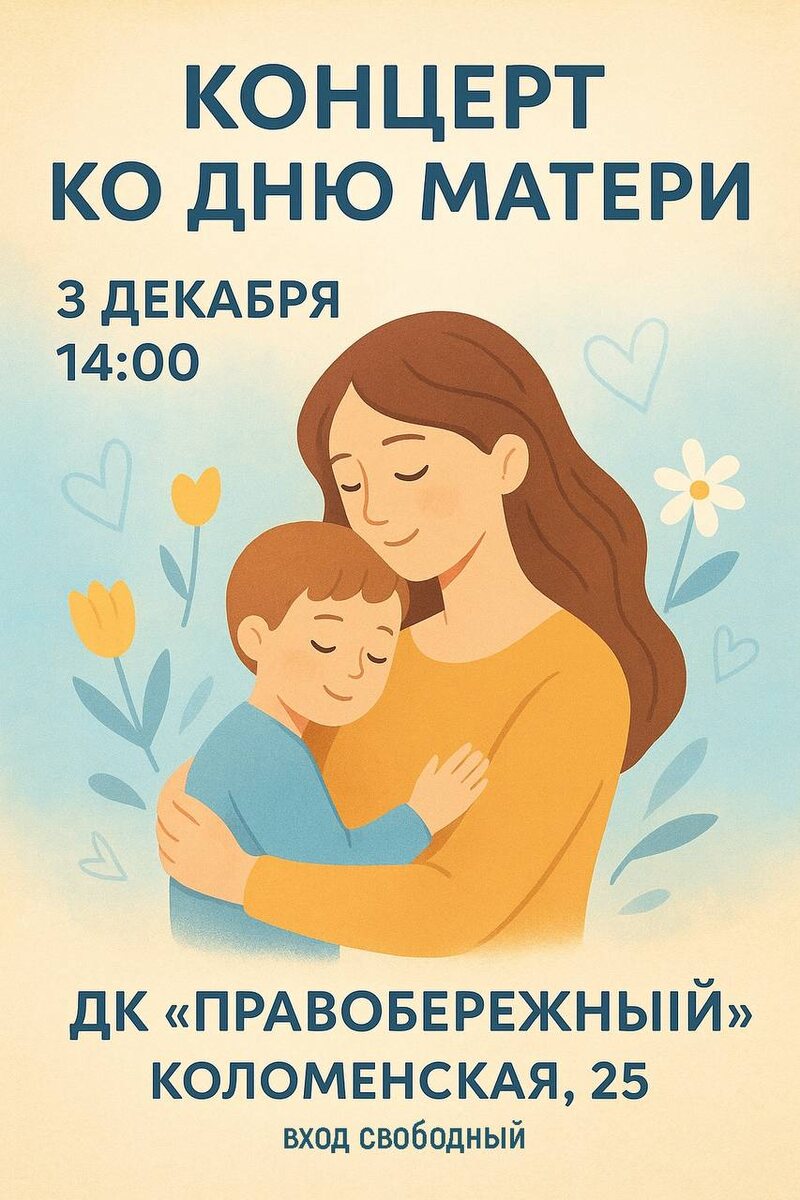 🎉 Концерт ко Дню Матери 🎉 Приглашаем всех на тёплый праздничный концерт, посвящённый самым дорогим людям — нашим мамам! 💛 📅 Дата: 3 декабря 🕑 Время: 14:00 🏛 Место: ДК «Правобережный», Коломенская, 25 В программе: 🎵 вокальные и инструментальные номера 💃 танцевальные постановки от детских и взрослых ансамблей 🎶 любимые песни о мамах, семье и Родине Праздник для всей семьи! Приходите поздравить мам и насладиться музыкой, песнями и танцами! 💐