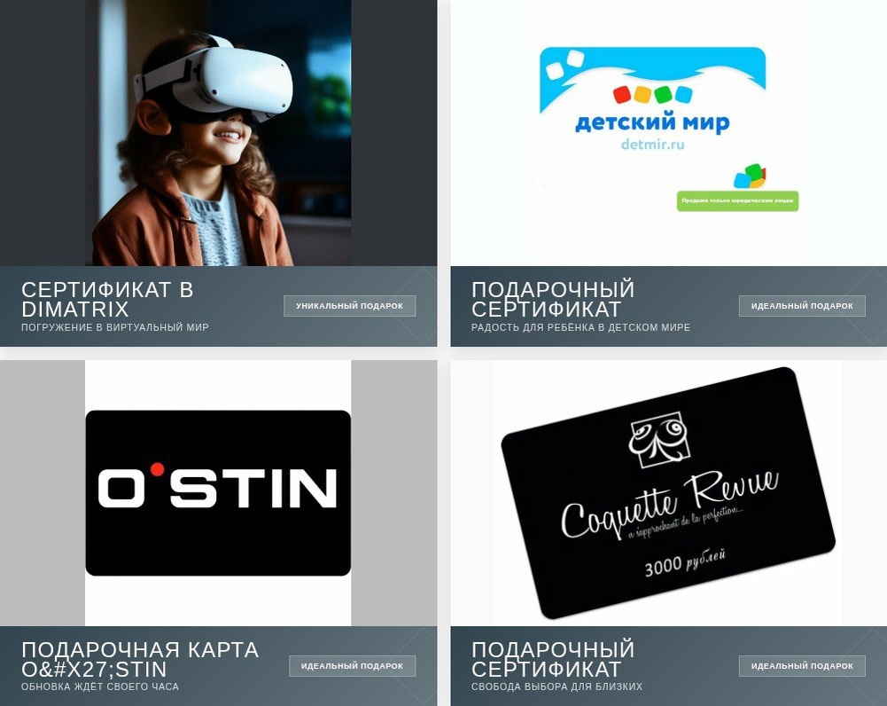 Крутые подарочные сертификаты — отличный выбор для подарка! Ищете, что подарить близким? Подарочные сертификаты — всегда беспроигрышный вариант! Вот несколько идей: — сертификат в клуб виртуальной реальности DiMatrix — для любителей острых ощущений 👉 ya.cc/88z6Cy — электронный сертификат «Детский мир» номиналом 1500 рублей — порадует маленьких непосед 👉 ya.cc/88z6Do — подарочная карта O'Stin номиналом 3000 рублей — для обновления гардероба 👉 ya.cc/88z6Ec — сертификат Romanovamakeup номиналом 3000 рублей — для поклонников косметики 👉 ya.cc/88z6FA — сертификат «Проффиш» на 20 000 рублей — для ценителей рыбалки и активного отдыха 👉 ya.cc/88z6Fv — сертификат «Комус» на 5000 рублей (срок действия до 31.12.2025) — для покупок офисных и хозяйственных товаров 👉 ya.cc/88z6CK Реклама. Информация о рекламодателе по ссылке.