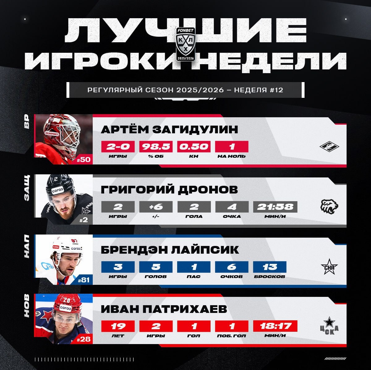 Привет, друзья! Сегодня мы поговорим о том, кто стал лучшим в КХЛ на 12-й неделе сезона, и почему это важно для любителей хоккея. Итак, КХЛ назвала лучших игроков этой недели. Лучшим вратарём стал Артём Загидулин из «Спартака». Он одержал две победы в двух матчах с коэффициентом надёжности 0,5. Это значит, что Артём показал высочайший уровень игры, пропуская минимальное количество шайб. Лучшим защитником стал Григорий Дронов из «Трактора». Он набрал 4 (2+2) очка в двух матчах. Это говорит о том, что Григорий не только обороняется, но и активно участвует в атакующих действиях команды. Лучшим нападающим признан Брендэн Лайпсик из СКА. Он набрал 6 (5+1) очков в трёх матчах. Это свидетельствует о том, что Брендэн находится в отличной форме и вносит значительный вклад в успех своей команды. Лучшим новичком признан защитник ЦСКА Иван Патрихаев. Он набрал 1 (1+0) очко в двух матчах. Это говорит о том, что Иван быстро адаптировался к уровню КХЛ и показывает уверенную игру. Эти достижения — не