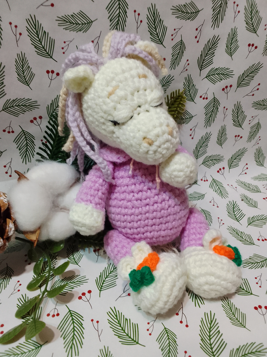 Всем здравствуйте . Рада , что вы заглянули на огонёк ☺️☺️☺️ Представляю вашему вниманию МК маленькой лошадки Сонечки . Вязание этой милашки принесло мне огромное удовольствие . Поэтому я спешу поделиться с вами , чтобы и вы успели связать такую лошадку к новому году 🎄 Давайте приступим 😉 Материалы Пряжа Milk Cotton молочного , бежевого , оранжевого , зелёного , сиреневого , светло-сиреневого цвета Наполнитель Крючок ✓2,5 Игла для сшивания Маркер Сокращения ВП - воздушная петля КА - кольцо амигуруми сбн - столбик без накида псн - полу столбик с накидом приб - прибавка уб - убавление Голова Молочный цвет . 6 ВП в КА 6 приб =12 сбн (1 сбн , 1 приб )*6=18 сбн -7. 18 сбн 8. 6 сбн , 6 приб из псн , 6 приб = 24 сбн 9. ( 1 сбн , 1 приб )*3 , (1 псн , 1 приб )*6 , ( 1 сбн , 1 приб )*3 =36 сбн 10.-14. 36 сбн 15. ( 4 сбн , 1 уб)*6= 30 сбн 16. ( 3 сбн , 1 уб)*6= 24 сбн 17. ( 2 сбн , 1 уб)*6 = 18 сбн (набиваем голову ) 18. ( 1