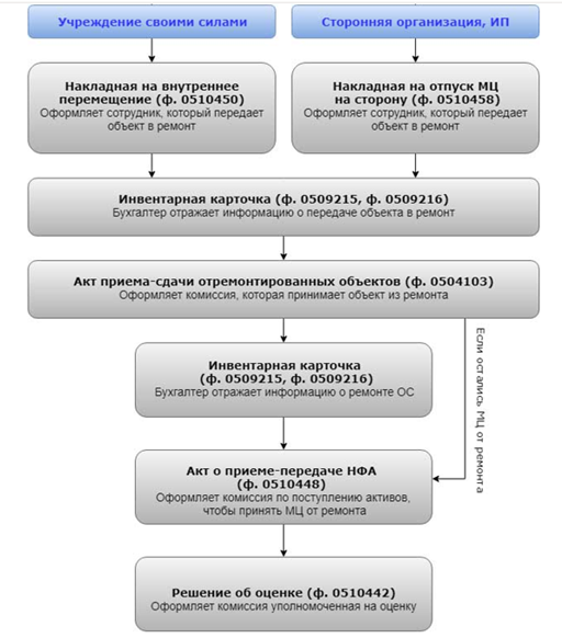 Ремонт основных средств (ОС) в учреждении может выполняться как силами сотрудников, так и с привлечением сторонних организаций или ИП. В зависимости от способа ремонта изменяется набор необходимых первичных документов и проводок.