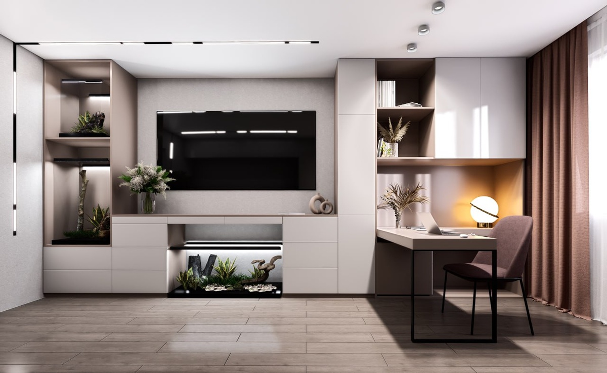 Комната сочетает в себе всё необходимое для жизни и отдыха. Есть рабочая зона, шкаф для одежды и диван-кровать с механизмом аккордеон — практичное решение, которое экономит место и выглядит аккуратно. Под телевизором предусмотрено место для террариума с удавом 🐍 — личное VIP-пространство главного экзота квартиры. Растения добавляют свежести и тепла, создавая ощущение уюта. Интерьер получился спокойным, светлым, с тем самым ощущением пространства, в которое приятно возвращаться. #ремонтподключ #дизайнпроект #интерьер #советыдизайнера #ремонт