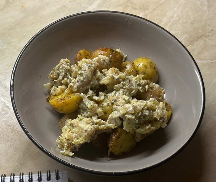 Добрый день мои друзья! недавно у меня появился казан-вок и я начинаю обучаться как работать с этой штукой, раньше у меня был опыт только с казаном на уличном гриле, дома только начинаю постигать азы, но сразу делаю что то более оригинальное чем плов, хотя рецепт плова, я думаю скоро тоже здесь будет, и так, на сегодня у нас рыбка в сливках: Сразу оговорюсь, тут будет рецепт только рыбы, рецепт картошки, что я делал на гарнир ранее уже описывал в этом рецепте: Кордон Блю с жаренным "Бэби"-Картофелем. Что нам потребуется: Филе белой рыбы: ~750гр - В этот раз взял пангасиуса, дешево, сердито, хорошо держит форму после разморозки, вы берите вашу любимую главное что бы не "рассопливывалась" как например зубатка. Лук: 1шт большого и парочку поменьше - можно взять шалот, но в этот раз в магазине не было. Мука: 150гр - для последующего обваливания рыбки. Сливки 20%: 200мл Чеснок: примерно пол головки зубьями - как всегда регулируйте по своей любви к нему. Сушенные укроп и петрушка: по столово