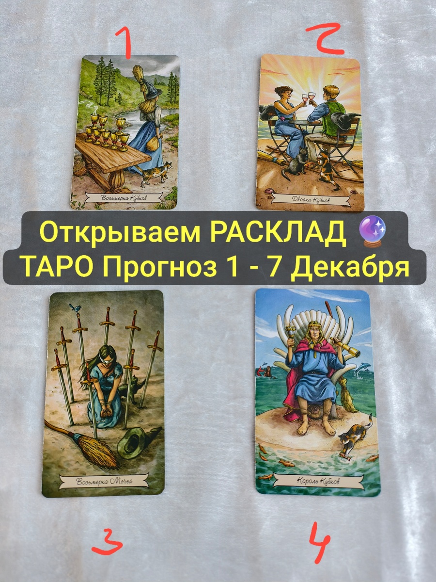 ❄️ Новая неделя зимы начинается в энергиях Полнолуния 5 декабря ➖ а значит, карты показывают не только события, но и внутренние трансформации. 🎙 Прослуша расшифровку расклад Прочитать ⬇️ Неделя отстранения, взросления и выхода из того, что больше не наполняет. Вы можете ясно почувствовать: «Мне пора уходить от привычного и выбрать что-то более истинное». Что будет происходить: — осознание того, что вы переросли старые роли, отношения, обязательства; — желание перемен; — отход от того, что давит эмоционально; — внутренний поиск «моего пути». Куда направить силы: В сторону обновления. На эту неделю оптимальны: — завершение старых дел, — отказ от ненужных обязательств, — уход от эмоциональных манипуляций, — выбор себя. Главное — не держаться за то, что больше не откликается. Восьмёрка Кубков помогает сделать шаг к новой версии себя.🔮🔮 Гармония, союз, тёплые эмоции, взаимность. Это неделя открытых сердечных контактов — романтических, дружеских, деловых. Что будет происходить