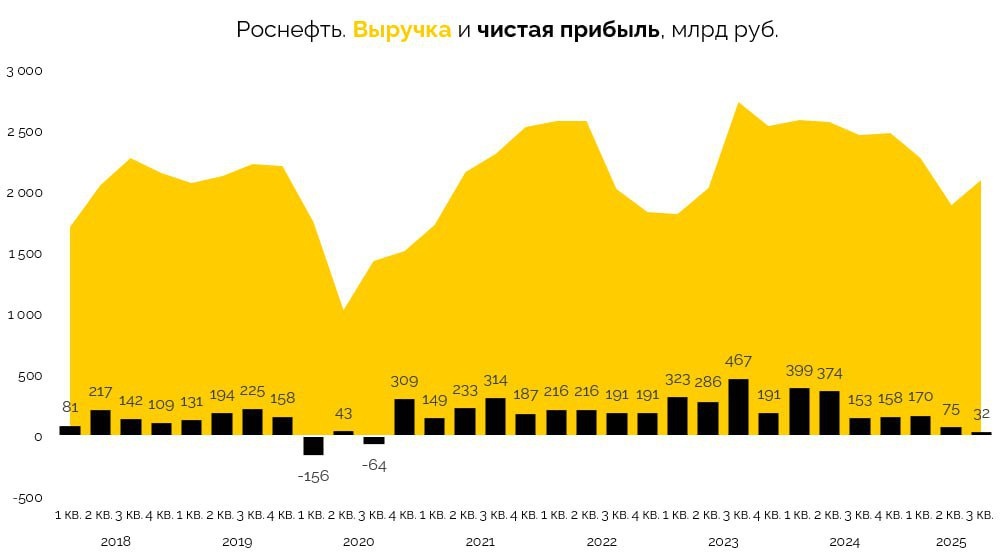 ⛽️ Роснефть смогла вернуться в 2020 г. Чистая прибыль сократилась до ковидных уровней — 32 млрд руб. С начала года снижение на 70%. Поэтому и видим, что текущая дивидендная доходность около 3%. Также видим риски, что Восток Ойл, скорее всего, перенесется на 2027 г. Сейчас компания попала в ножницы крепкого рубля и снижающихся нефтяных цен. Дополнительное давление в IV кв. окажут выросшие дисконты из-за санкций. 💬 Telegram | 📺YouTube|💰Private-чат