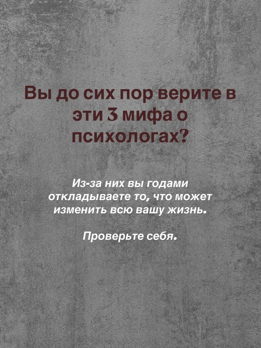 Вы до сих пор верите, что психолог — это «мозгоправ» для тех, у кого «совсем всё плохо»? Пора развенчивать мифы, которые мешают вам жить лучше. В этой каруселе честно и без прикрас: ➜ 3 главных мифа о психологах, которые тормозят вас ➜ 4 навыка, которые вы на самом деле прокачиваете на терапии (это круче, чем кажется) ➜ Почему это больше похоже на спортзал, чем на исповедь ➜ И что в итоге меняется в жизни Главное — начать. А первый шаг — перестать верить в сказки. А как вы думаете, какой миф самый живучий? Поделитесь в комментариях