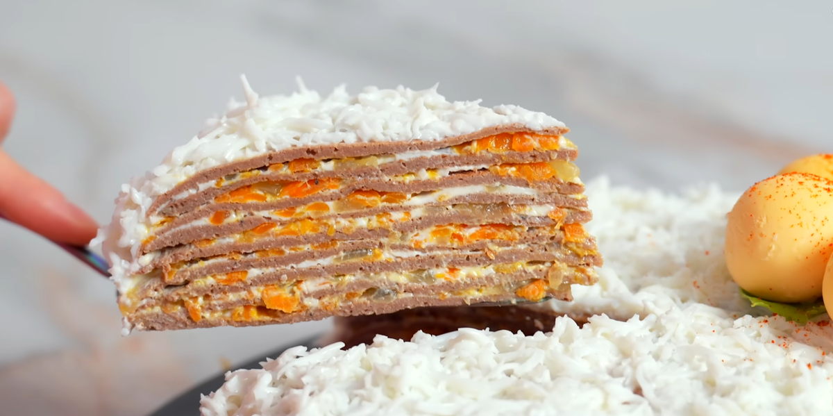 Хотите удивить гостей необычным, но в то же время сытным и вкусным блюдом? Попробуйте приготовить печёночный торт — оригинальную холодную закуску, которая станет настоящим украшением новогоднего стола. Здравствуйте, дорогие друзья! Сегодня я хочу рассказать вам о рецепте печеночного торта. 1.Возьмите 500 граммов печени. 2.Нарежьте лук кубиками. Вес — 150 граммов. 3.Добавим одно яйцо и 150 миллилитров молока. Всё это измельчаем погружным блендером. 4.Когда масса станет однородной, добавьте чайную ложку соли, половину чайной ложки перца или по вкусу и 100 граммов муки. 5.Все ингредиенты быстро перемешивайте с помощью блендера. После добавления муки не нужно долго взбивать смесь, достаточно, чтобы мука равномерно распределилась среди жидких компонентов. Если тесто получается слишком жидким, добавьте немного больше муки. Если оно слишком густое, разбавьте его молоком. Тесто готово. Отставим его на 15 минут. Тем временем займемся начинкой. 6.Возьмите 200 граммов моркови