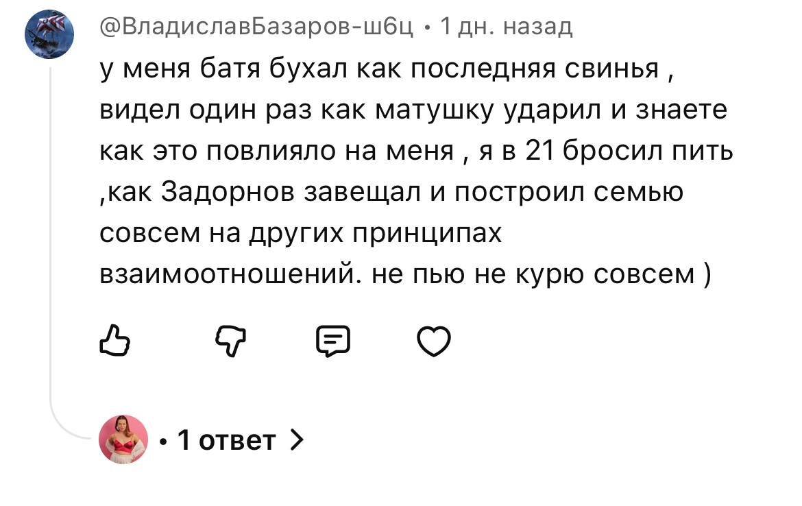 Отец пил и бил, а я, выросши, строю семью и образ жизни на совсем других принципах. После разбора Прохора Шаляпина открылся портал в мир вот таких комментариев. И часто это истории о том, что я вырос другим. Как думаете? В чем подвох у этой, казалось бы, победной установки? (Пишите в комментах, проверю свою гипотезу). 🔥 — если тоже ловили себя на этой фразе