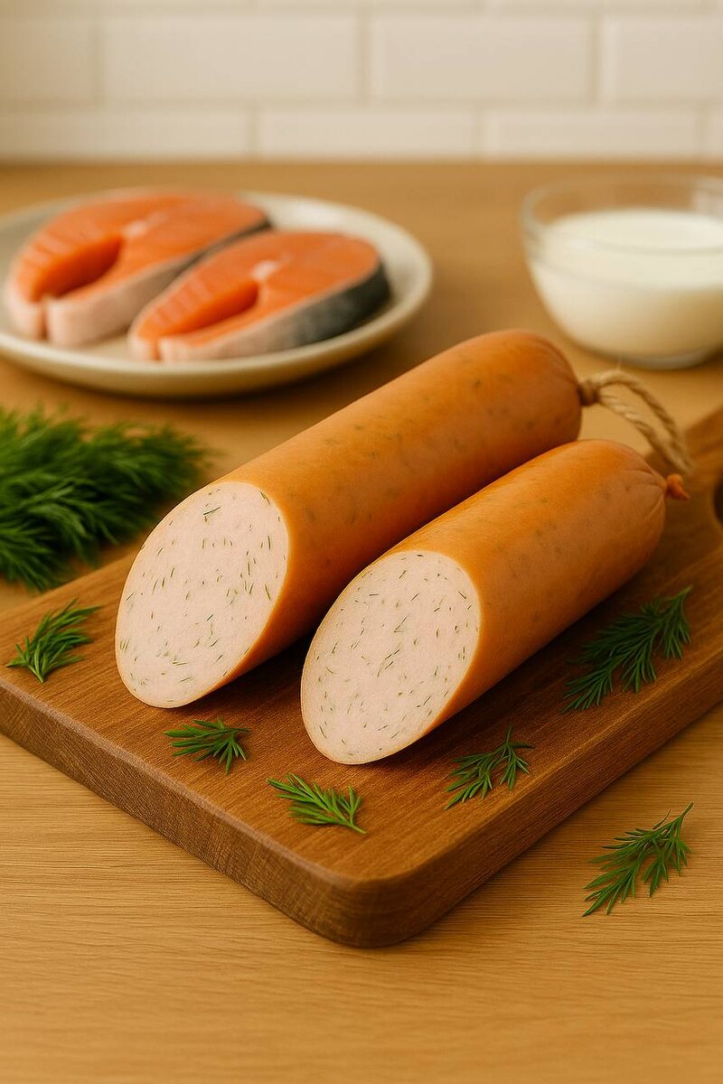 Колбаса «Лососевая с зеленью» (варёно-копчёная, Ø 45 мм) 👉🏻 Вам понадобится (на 1 кг фарша): • Филе лосося (без кожи и костей) – 700 г • Филе судака или трески – 200 г • Сливки 20% – 100 мл • Лёд – 80 г • Яичный белок – 1 шт. • Нитритная соль – 6 г • Соль поваренная – 8 г • Сахар – 3 г • Укроп свежий (мелко рубленный) – 10 г • Перец белый молотый – 1 г • Коллагеновая оболочка Ø 45 мм – 2 м Готовим фарш 🧑🏼🍳 : Филе лосося и судака тщательно проверяем на наличие костей, охлаждаем до −2 °C. Пропускаем через решётку 4 мм. В куттере или блендере соединяем рыбу с солью, сахаром и белком. Постепенно вливаем сливки и добавляем лёд для поддержания низкой температуры. Вымешиваем до образования однородной эластичной массы. В конце вмешиваем рубленый укроп. Готовый фарш охлаждаем 6–8 ч при +2...+4 °C. Набиваем оболочку 🥊 : Замачиваем коллагеновую оболочку в воде, надеваем на шприц. Набиваем плотно, формируем батоны длиной 20–25 см. Перевязываем шпагатом, прокалываем иглой для удаления воз