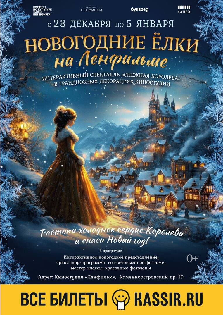 Легенда о «Снежной королеве» вновь возвращается на «Ленфильм» Киностудия «Ленфильм» приглашает детей и их родителей на главное зимнее приключение - Новогоднюю елку! 🎄 Вас ждет уникальная новогодняя программа по мотивам легендарного кинофильма «Снежная королева». В этом году павильоны студии превратятся в настоящую Страну чудес, где современные технологии помогут волшебству стать реальностью. 🔵В съемочном павильоне созданы декорации заснеженного замка Снежной королевы, создающие атмосферу сказки. 🔴Крио-пушки вызовут снежные бури, а стробоскопы развеют ледяные чары. 🔵Четыре фотозоны с героями сказок позволят сделать яркие снимки. 🔴Артисты и акробаты сделают праздник незабываемым. 🔵Программа рассчитана на семейную аудиторию и станет замечательным событием зимних каникул. 🔴После выступления дети получат новогодний подарок. Билеты по ссылке. 🎟️ Стоимость билетов: При покупке до 08.12.2025: 3000 рублей без подарка 4500 рублей с подарком При покупке после 08.12.2025 3500 рублей