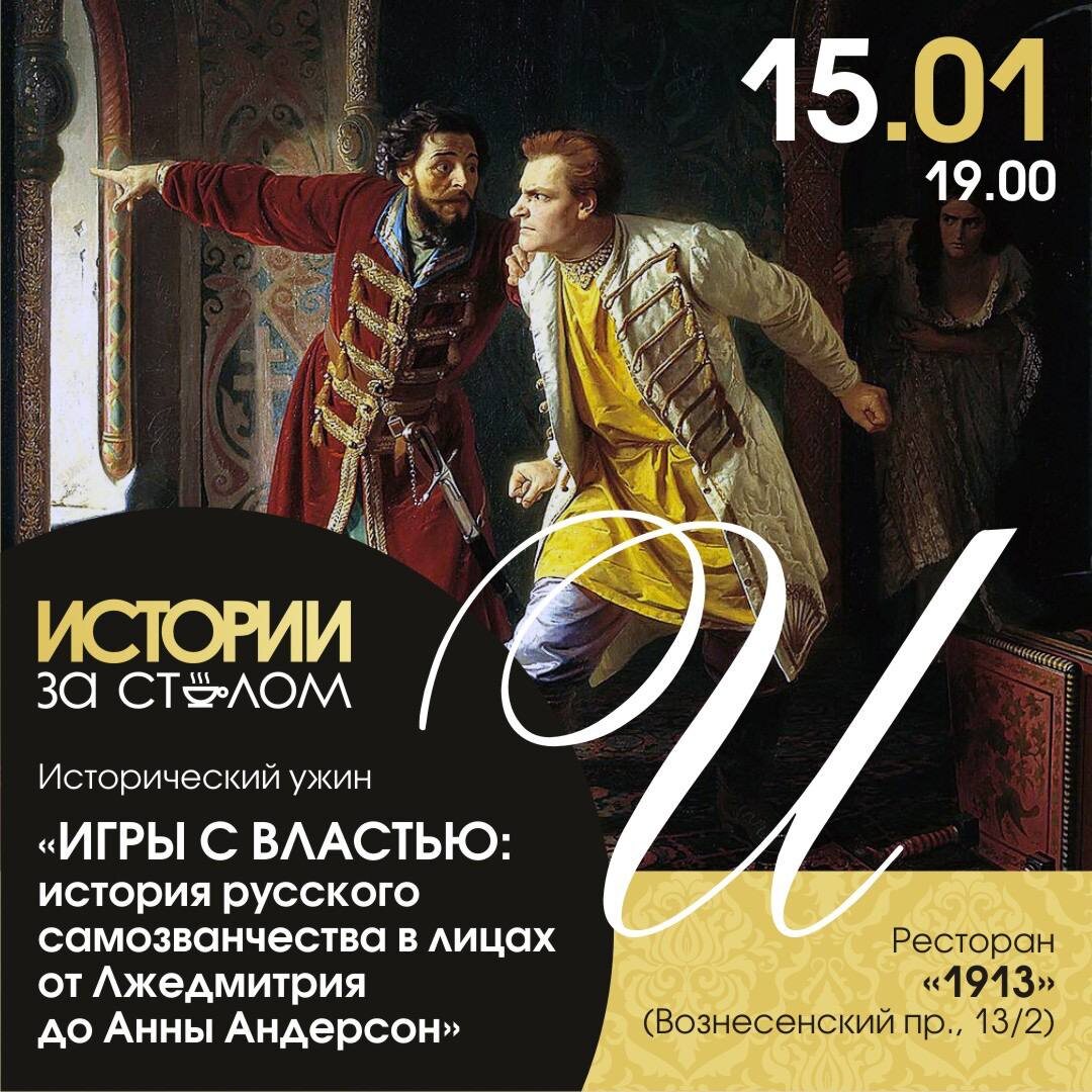 🎭Исторический ужин «Игры с властью: история русского самозванчества в лицах от Лжедмитрия до Анны Андерсон» 15 января в 19.00 ✔️Ресторан «1913» (Вознесенский пр., 13/2) «История феномена самозванчества в России - это история народа, которому всегда удавалось поставить власти шах, хотя и не всегда - мат» - так метко знаменитый историк, Ключевский, предваряет рассказ о появлении первых самозванцев в Смутное время. Несмотря на то, что самозванчество в целом не русское ноу хау, в России этот феномен вышел далеко за рамки кражи личности и хитроумной мистификации. На нашем ужине от культуролога Лилии Афиногеновой, мы узнаем о: ✨времени и обстоятельствах появления первых самозванцев на русской земле. ✨судьбах самых знаменитых самозванцев русской истории: Петрах III (именно за него выдавал себя Емельян Пугачев), княжне Таракановой, «спасшихся» детях Николая II. ✨ «анатомии» русского самозванства, личных мотивах самозванцев, факторах их успеха и причинах краха. В меню: 1️⃣Закуска из нерк