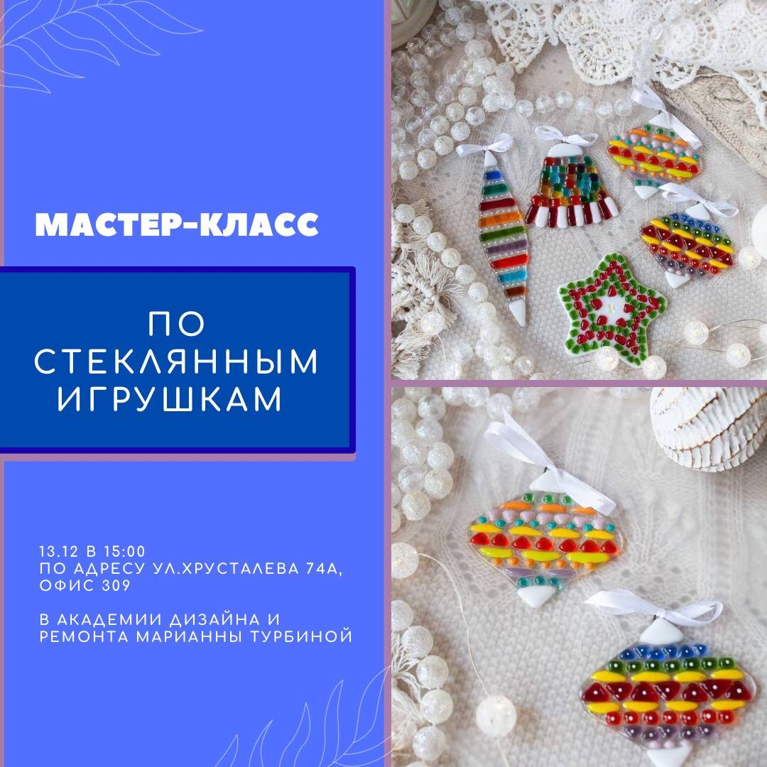 Дорогие дизайнеры, пришла пора готовиться к Новому году! Предлагаю начать с мастер-класса по стеклянным игрушкам в технике фьюзинг. Мы будем создавать из стекла новогодние игрушки двух разных форм (на выбор), угощения и приятная атмосфера прилагается. Мастер-класс будет проводить дизайнер и художница по стеклу - Козачун Ольга Дата и время: 13.12 в 15:00 по адресу ул.Хрусталева 74а, офис 309 в Академии дизайна и ремонта Марианны Турбиной Стоимость: 2650 р. Длительность: 1,5-2 часа Готовые работы можно будет забрать через неделю после запекания. Ссылка на регистрацию на мк и оплату https://akademy-design-mt.timepad.ru/event/3689618/