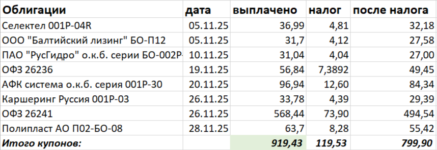 С первым днём зимы! У нас погода за окном запаздывает минимум на месяц. Однако, это не повод забыть про итоги ноября. Купонно-дивидендные выплаты В ноябре мне в портфель приходили только купоны по облигациям. Все данные традиционно внесла в табличку: 919,43 рублей купонами. Для месяца без дивидендов,я думаю, вполне неплохо. Анализ результата Всегда хочется понимать, в правильном ли я иду направлении. Для этого я сравниваю результат с итогами год и два назад. Так ноябрь 2024 года мне принес 235,82 рублей, а в 2023 году - 75,08 рублей. Я думаю, отличная динамика! С результатами прошлых месяцев 2025 года я не сравниваю: купоны приходят с разной периодичностью, а дивиденды зависят от многих факторов. Но их всегда можно посмотреть здесь: Январь, Февраль, Март, Апрель, Май, Июнь, Июль, Август, Сентябрь, Октябрь. В этом году я уже не перешагну выплату в 12000 за год. Но в будущем году, надеюсь, результат будет лучше. На сегодня всё, желаю всем успешных инвестиций!)