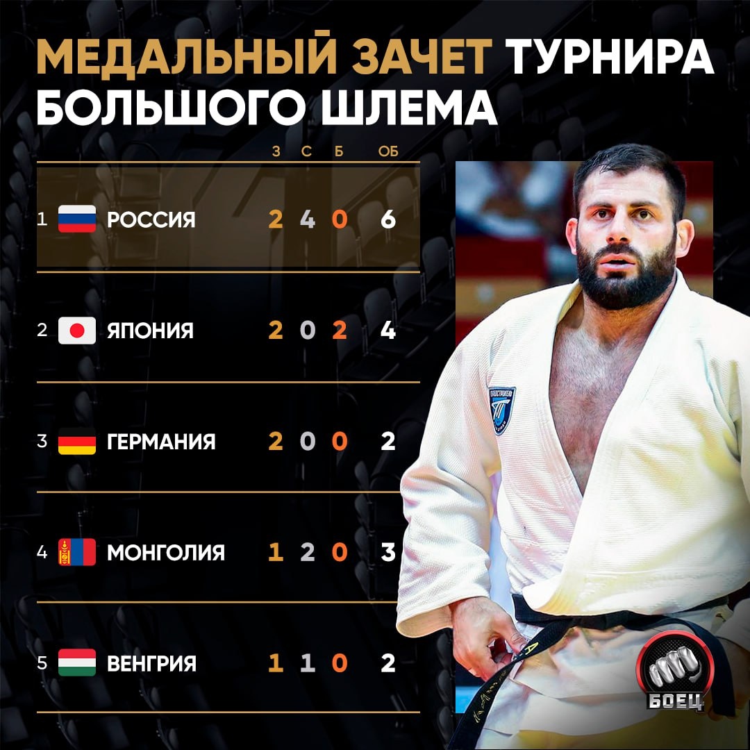 Сборная России стала лучшей в медальном зачете на прошедшем турнире Большого шлема 🏆 Российские дзюдоисты завоевали шесть наград (2 золота и 4 серебра) 🥇🥈 Напомним, что это первые соревнования, где российская сборная выступает с национальным флагом и гимном 🇷🇺 Отличное выступление для нашей команды 👏