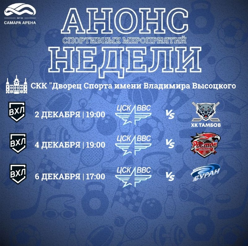 Самара Арена | Дворец Спорта Начало зимы и День хоккея праздновать можно всю неделю! В СКК "Дворец Спорта имени Владимира Высоцкого" нас ждут целых три захватывающих матча "ЦСК ВВС". 🔹2 декабря | 19:00 "ЦСК ВВС" открывает домашнюю серию встречей с ХК "Тамбов" 🔹4 декабря | 19:00 "ЦСК ВВС" сыграет против ХК "Ростов" 🔹6 декабря | 17:00 Самарские "летчики" принимают воронежский "Буран" 📍СКК «Дворец Спорта имени Владимира Высоцкого» 🙌 Сохраняйте расписание и приходите на трибуны Дворца Спорта! Атмосфера спортивного праздника вам будет обеспечена! ГАУ СО "Самара Арена" #спорт #навыходных Подписаться