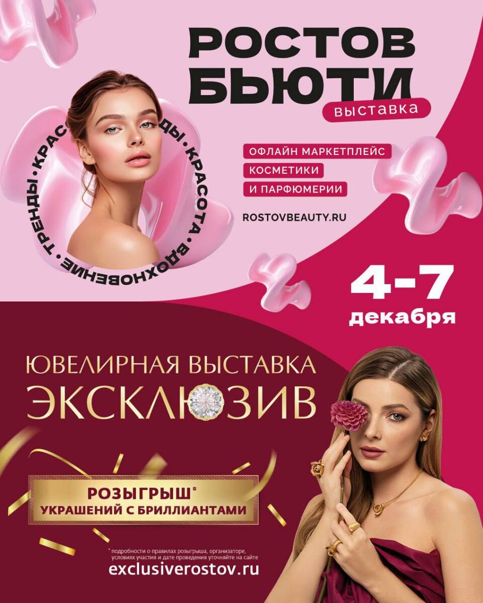 🎉 С 4 по 7 декабря ДонЭкспоцентр станет центром красоты, стиля и блеска! В эти дни вас ждут сразу две масштабные выставки — новый проект «Ростов Бьюти» и юбилейная 30-я ювелирная выставка «Эксклюзив». 💄 Ростов Бьюти — всё о красоте, здоровье и стиле! • Мастер-классы от топовых визажистов и стилистов • Выступления экспертов beauty-индустрии • Лекции опытных докторов о женском здоровье • Большой офлайн-маркетплейс косметики и парфюмерии 💍 Эксклюзив — широкий выбор украшений от ведущих ювелирных заводов России. • Золото, серебро, платина • Бриллианты и натуральные камни • Бижутерия Ждем вас на выставках! Вход свободный, необходима регистрация. 📍 ДонЭкспоцентр, пр. М. Нагибина, 30 📅 Даты: 4–7 декабря 2025 года