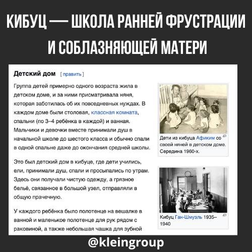 МАТЬ ИЗ КИБУЦА - МАТЬ, КОТОРОЙ НЕ ХВАТАЕТ Этот пост вдохновлён материалом из канала «Инъекции психоанализа» (источник: https://t.me/LapsychanalyseNietzsche/18551). И отдельная благодарность Георгию Чехарину @Georgiyiy— он регулярно присылает мне отличные книги, и отчасти благодаря ему в мою рабочую библиотеку попадают вещи, которые невозможно обойти вниманием. Сегодня хочу объяснить одну важную тему для тех, кто не знаком с историей кибуцев и почему они так волнуют психоаналитиков. Что такое «мать из кибуца» и почему это важно? В кибуцах дети жили не с матерью, а в детских домиках: воспитатели днём, ночные няни ночью, родители — всего несколько часов в день. Мать не исчезает полностью, но её присутствие фрагментировано: она как будто есть, но одновременно не там, где ребёнок в ней нуждается. Это не «мертвая мать» Грина — депрессивная, полностью выключенная. Это то, что Фэйрберн называл соблазняющей матерью: непостоянное, возбуждающее, но недоступное эмоциональное присутствие. Т