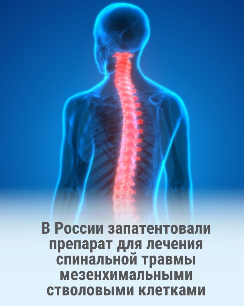 В России запатентовали препарат для лечения спинальной травмы мезенхимальными стволовыми клетками. Специалисты Федерального центра мозга и нейротехнологий ФМБА России разработали новый подход к лечению спинальной травмы стволовыми клетками, позволяющий восстановить целостность спинного мозга и вернуть пациенту возможность двигаться. Лечение представляет собой введение высокотехнологичного препарата, созданного на основе донорских мезенхимальных стволовых клеток. Препарат стимулирует регенерацию тканей непосредственно в месте повреждения. Клинические исследования показали, что комбинация мезенхимальных стволовых клеток и гидрогеля в качестве основы, а также проведение нейромодуляции в течение нескольких месяцев после травмы дает наилучший терапевтический результат, восстанавливая неврологические поражения. «Лечение основано на аллогенной трансплантации мезенхимальных стволовых клеток, которые, в том числе, содержатся в ткани пупочного канатика. Как известно, эти стволовые клетки пом