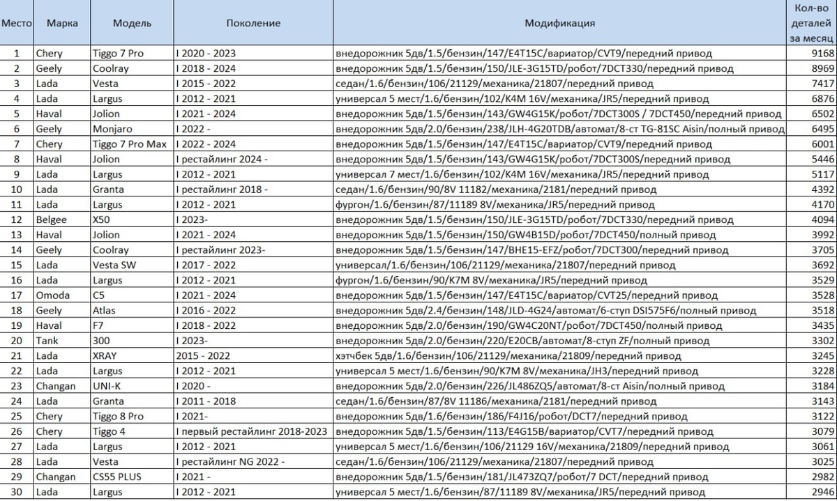 Топ-30 модификаций, на которые были подобраны детали в нашем каталоге в ноябре 2025 года