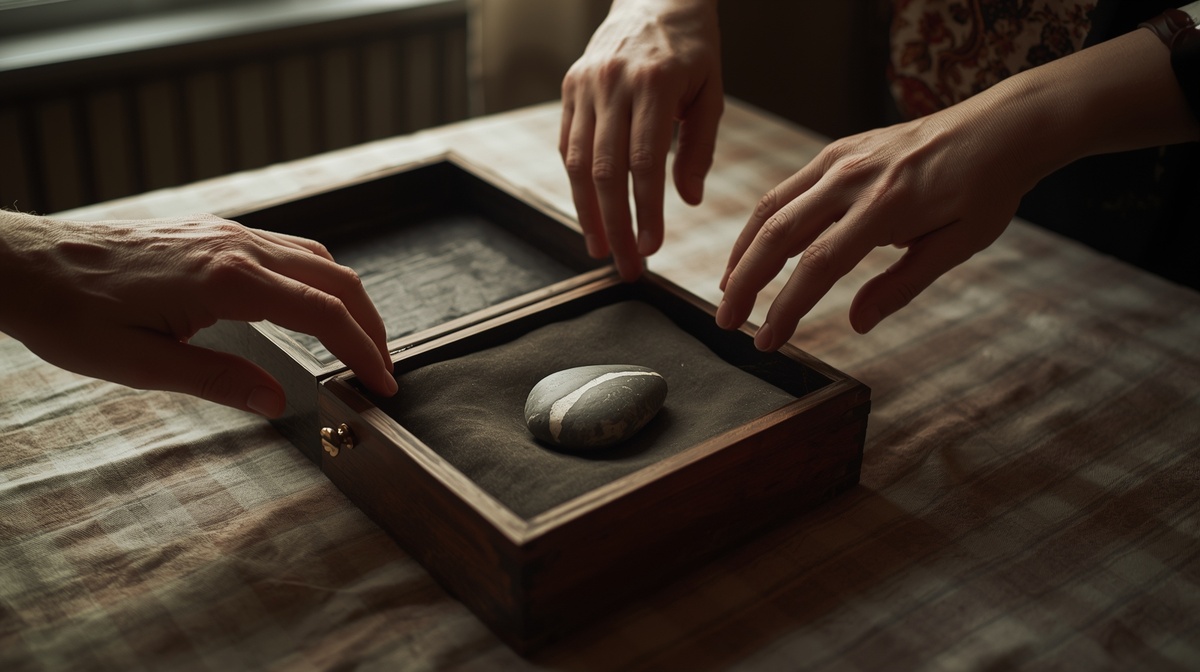 Дедушка взял камень, подержал его в ладони, как будто взвешивая, и передал маме. Мама на секунду приложила его к щеке, закрыла глаза, и уголки ее губ дрогнули. Потом камень перешел к папе. Он сжал его в кулаке, костяшки побелели, взгляд ушел куда-то внутрь себя. И, наконец, камень вернулся к бабушке. Она поднесла его к губам, прошептала что-то неразборчивое, теплое, и аккуратно положила обратно. Шкатулка закрылась. Буфет захлопнулся. Дедушка хлопнул в ладоши один раз, резко.