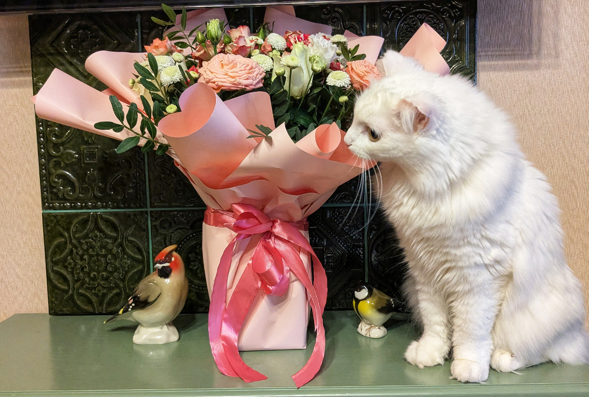 Друзья, приветствую вас на канале "Счастлива по собственному желанию". Вчера заболел младший сын, плохо себя чувствовал, температурил. Конечно, мне было не до праздника. Не думала, что кто-то будет меня поздравлять. Однако муж про праздник не забыл. Они с сыном пошушукались, и муж подарил мне от себя и сына вот такой букет. Кошка Зефирка немедленно стала его нюхать. Еще бы, весной пахнет! Настроение немножечко улучшилось. А к вечеру и старший сын подъехал с розами. Такие интересные, в полосочку. Кроме того, силами мужчин был организован праздничный ужин с роллами и пирожными от Вольчека. Красота! Была и развлекательная часть 😂 Ребенку надо было выполнить задание на сайте РешиЕГЭ по русскому языку. Чтобы не поставили двойку, мы со старшим тряхнули стариной и выполнили задание. Ну, что я вам могу сказать... Ваша покорная слуга не так хорошо знает русский язык, как предполагала. Кое в чем я ошиблась. А дети, наоборот, предложили правильный вариант. Так что тот, кто считает, что ЕГЭ нап