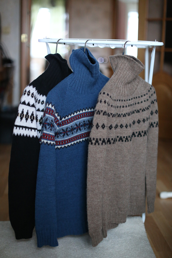 Была у меня такая традиция: дарить на новый год бумажку, на которой написано или даже нарисовано то, что я хотела подарить, но не успела к празднику сделать. Как всегда: сначала не знаешь, что, а потом уже на это не хватает времени. Так я дарила "варежки", ещё какую-то мелочовку, и даже свитер. Вот про свитер сейчас и расскажу. Обещанный подарочный "Синий свитер со снежинками": Специально сегодня сфотографировала рядом с недавно связанными свитерами, чтобы были доказательства, что "Свитер со снежинками" был, есть и всё ещё очень привлекателен, несмотря на регулярную эксплуатацию. Заодно можно сравнить свитера между собой по высоте рисунка и в целом посмотреть, какое впечатление они создают, находясь рядом. Все свитера начаты одинаково, как реглан с ростком, но только синий свитер регланом и остаётся; остальные - почти сразу от горловины переходят на круглую кокетку. Чёрный свитер связан из Пехорки "Австралийский меринос", коричневый - из пряжи "Флора" Дропс, а синий - из пряжи "Йорк",