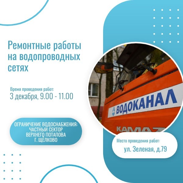 🚧🛠 Ремонт сетей холодного водоснабжения по улице Зеленой В связи с проведением аварийно-восстановительных работ на трубопроводе диаметром 100 мм (Щелково ул. Зеленая, д.79) будет отключено холодное водоснабжение 3 декабря 2025 г., с 9.00 до 11.00 по адресам: ул. Школьная - все дома; ул. Текстильщиков - все дома; ул. Ломоносова - все дома; ул. Молодежная - все дома; ул. Мичурина от д.81 до д.103; ул. Зеленая - все дома; ул. Западная - все дома; ул. 1-й Западный пр-д - все дома; ул. Тимирязева - все дома. Приносим извинения за доставленные неудобства. Телефон аварийно-диспетчерской службы Водоканала: 84965621172. Подписаться🔵Вакансии🔵Личный кабинет 🔵Чат-бот Телефон аварийно-диспетчерской службы водоканала: 84965621172.