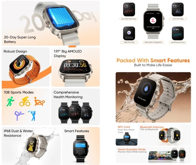 Корпус выполнен с металлической рамкой и имеет степень защиты IP68, поэтому часы не боятся пыли и влаги. Новинка предлагает 108 спортивных режимов, включая бег, ходьбу, велосипед, тренажёрные программы и йогу.