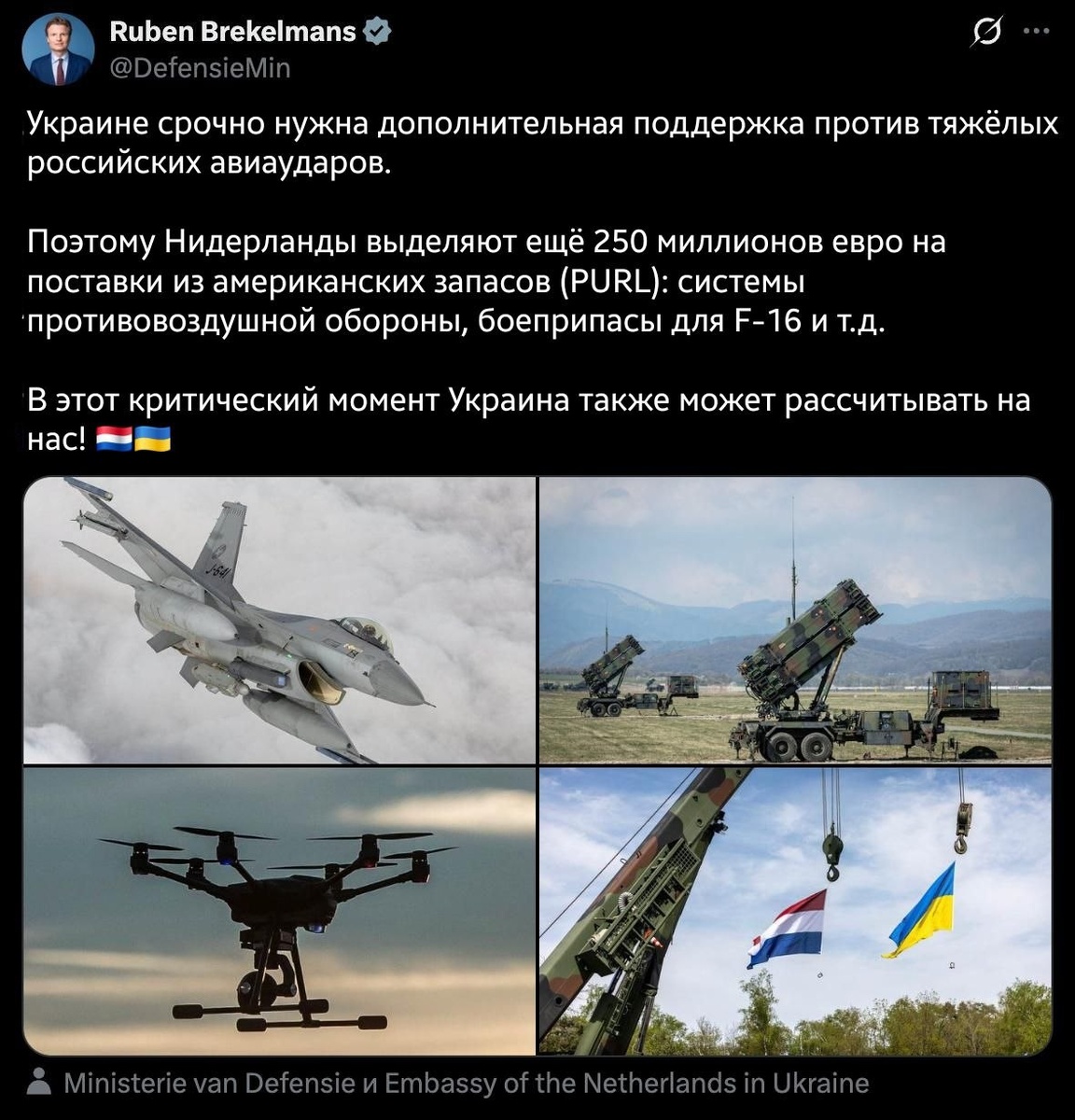 ⚡️Нидерланды выделят €250 млн на вооружение для Украины, — министр обороны Брекелманс. Он сообщил, что средства направят на закупку у США систем ПВО, боеприпасов для F-16 и другого вооружения по программе PURL. Ахуенно США мирное соглашение готовят, продавая Украине оружие 🤣🤣🤣