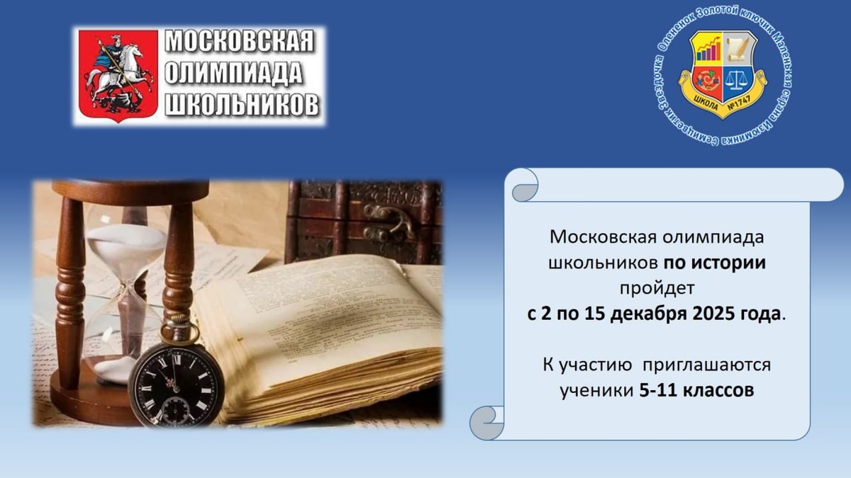Дорогие ребята! 🤗 Открыта регистрация на дистанционный этап Московской олимпиады по истории. Для прохождения необходимо быть зарегистрированным в системе «Сириус.Онлайн» и подать заявку на саму олимпиаду. Дистанционный этап пройдет с 2 по 15 декабря 2025 года. Задания будут подготовлены для учеников 5-11 классов. Для 5 класса состязание будет состоять из одного тура. Участников, успешно справившихся с заданиями дистанционного этапа, планируется отметить похвальными грамотами. Для 6-11 классов дистанционный этап будет являться отборочным. Школьников, успешно выступивших на нем, вместе с победителями и призерами финала прошлого года пригласят на заключительный этап. Его планируется провести 14 марта 2026 года. 💐 Желаем удачи! #ДОНМ #ШколыКолледжиМосквы #Школа1747