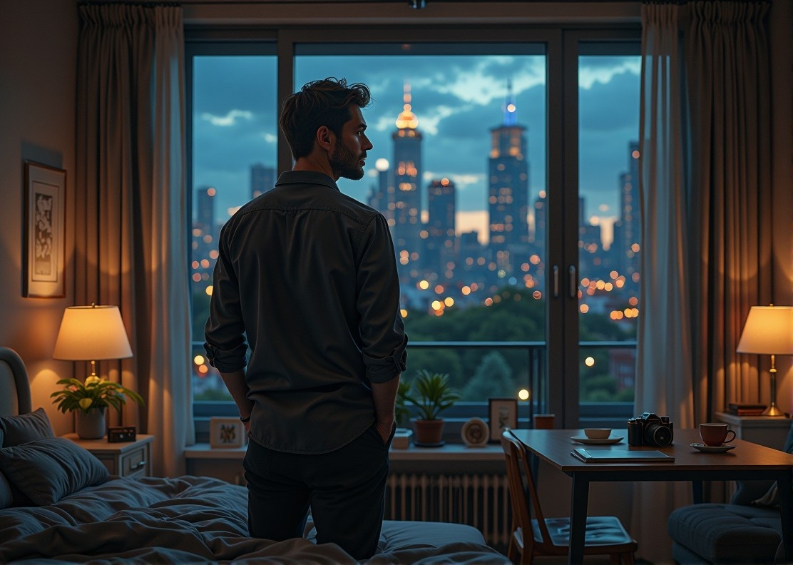 На одной из фотографий он поймал себя стоящим у окна с лёгким наклоном головы, словно вслушиваясь в звуки города. На подоконнике — стопка книг, сверху — та самая по психологии отношений.
