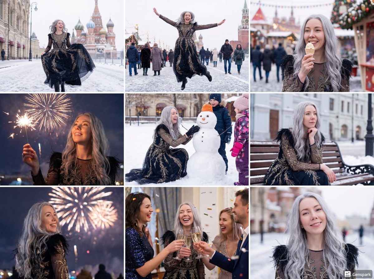 Не удержалась и сделала себе новогоднюю фотосессию в Нана Банана Про 🤣 Закинула свой портрет и написала вот такой промт: Создай захватывающе интригующую историю из 9 частей с 9 изображениями на одной картинке используя человека с Изображения 1. Постоянство лица: Сохрани черты лица человека точно такими же, как на Изображении 1, но измени прическу на длинные серебристые волосы уложенные волнами. История должна быть про то как женщина в новогоднем платье от кутюр в стиле Александра Макквина веселится на новогодних улицах Москвы - бегает, прыгает, ест мороженное, запускает хлопушки, лепит снеговика и прочие эмоциональные действия. История должна иметь эмоциональные взлёты и падения, заканчиваясь элегантным кадром портрета счастливой женщины - черты лица женщины точно такие как на изображении 1. Личность женщины должна оставаться постоянной, черты лица такие же как на изображении 1. но она может и должна быть показаны с разных углов и расстояний. Пожалуйста, генерируй изображения по одн