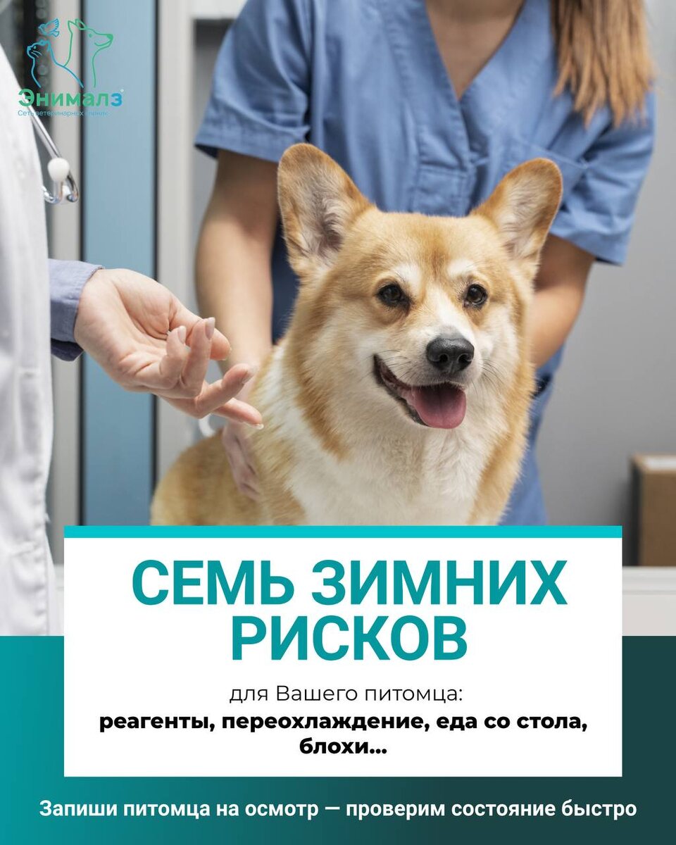 🔘🔘🔘🔘 Зимние Опасности: 7 Рисков для Вашего Питомца 😩 😊 Инструкция от Ветеринарной Клиники «Энималз»: Зима — время волшебства, но и скрытых угроз для наших четвероногих друзей. Сегодня мы хотим предупредить о семи самых распространенных зимних рисках, которые требуют вашего внимания! 🤢 1⃣Отравление антифризом: Антифриз привлекателен для животных на вкус, но даже небольшое количество смертельно опасно. Тщательно следите за утечками и храните его в недоступном месте. 🤔2⃣ Реагенты на дорогах: Соль и химикаты раздражают лапы, вызывают ожоги и могут быть токсичны при слизывании питомцами. Используйте защитный воск или ботиночки, тщательно мойте лапы после каждой прогулки. 😕3⃣ Переохлаждение: Долгие прогулки на морозе, особенно для короткошерстных или пожилых животных, грозят гипотермией и обморожениями. Сократите время пребывания на улице в сильные холода и используйте теплую одежду. 😢4⃣ Скользкие поверхности и травмы: Гололед увеличивает риск падений, растяжений, вывихов и п