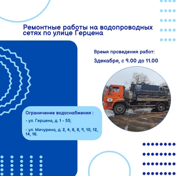 🔧 Ремонтные работы по улице Герцена в связи с проведением аварийно-восстановительных работ на трубопроводе диаметром 100 мм (ул. Герцена, д.30) будет прекращена подача воды 3 декабря, с 9.00 до 11.00 по адресам: ➡️ул. Герцена, д.1, 2, 3, 4, 5, 6, 7, 8, 9, 10, 11, 12, 13, 14, 15, 16, 17, 18, 19, 20, 21, 22, 23, 24, 25, 26, 27, 28, 29, 30, 31, 32, 33, 34, 35, 36, 37, 38, 39, 40, 41, 42, 43, 44, 45, 46, 47, 48, 49, 50, 51, 52, 53, 54, 55; ➡️ул. Мичурина, д.2, 4, 6, 8, 9, 10, 12, 14, 16; Приносим извинения за доставленные неудобства. 📞 Телефон аварино-диспетчерской службы водоканала: 8-4965621172. Подписаться🔵Вакансии🔵Личный кабинет🔵Чат-бот