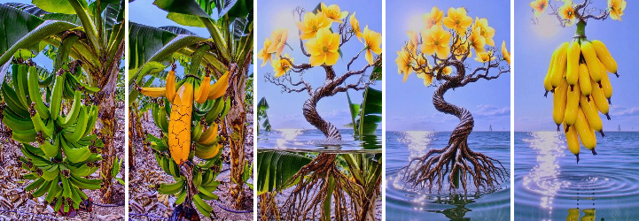 Видео из фото "Банановая фантазия" это авторская шуточная видео миниатюра. Видео из фото "Банановая фантазия" собрано из пяти взаимосвязанных мизансцен. Мизансцены следуют одна за другой. Первый кадр последующей мизансцены является последним кадром предыдущей мизансцены. Такой приём создаёт эффект бесшовного воспроизведения в данном видео из фото. Вот кадровка видео из фото мизансцены 1. Вот кадровка видео из фото мизансцены 2. Вот кадровка видео из фото мизансцены 3. Вот кадровка видео из фото мизансцены 4. Вот кадровка видео из фото мизансцены 5. По мнению автора, такие кадровки данного видео из фото сами по себе интересны, а некоторые забавны. Первая мизансцена создавалась из авторского фото сделанного на банановой плантации. Остальные мизансцены создавались из последних кадров предыдущих мизансцен. Для каждой мизансцены писался свой сценарий. Компоновалось конечное видео из фото в видео редакторе. Озвучивалось конечное видео из фото с помощью свободной (без авторских прав) библиот