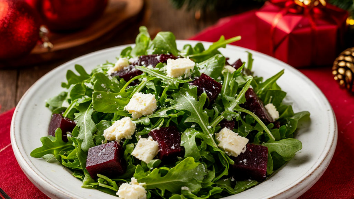 Отличная идея: подать салат со свёклой и рукколой на большой круглой тарелке, разложив зелень в виде рождественского венка.
