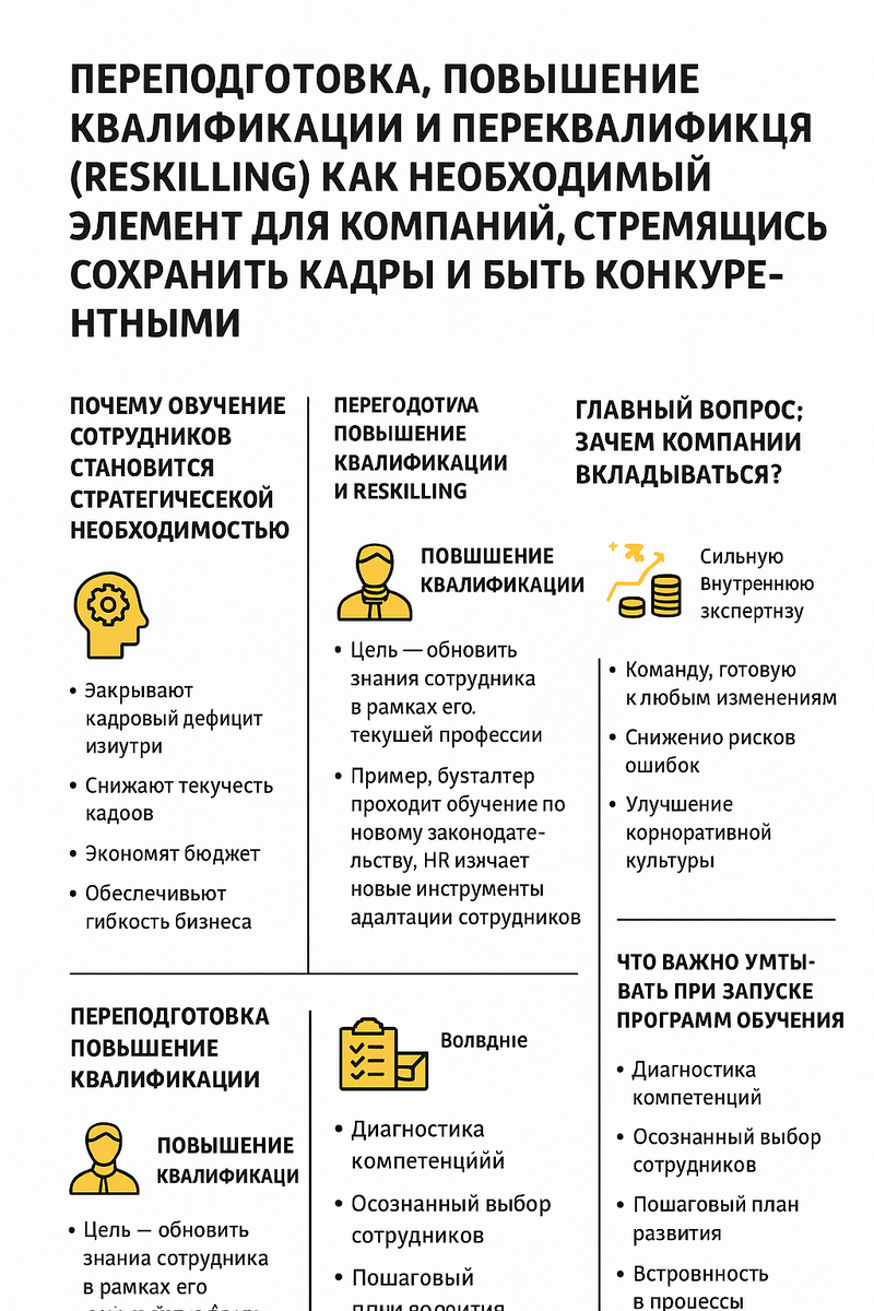 Мир бизнеса меняется быстрее, чем успевает обновляться любая должностная инструкция. Новые технологии, искусственный интеллект, автоматизация процессов, изменение клиентских запросов — всё это заставляет компании пересматривать подходы к управлению персоналом. Сегодня уже недостаточно просто нанять «готового специалиста» и надеяться, что его компетенций хватит на годы вперёд. Чтобы оставаться конкурентоспособными, организации обязаны вкладываться в развитие людей: в переподготовку, повышение квалификации и особенно — в переквалификацию (reskilling). Почему обучение сотрудников становится стратегической необходимостью Если раньше обучение рассматривалось как «приятное дополнение», то сейчас это — один из ключевых факторов устойчивости бизнеса. Компании, которые развивают своих людей, получают сразу несколько преимуществ: Закрывают кадровый дефицит изнутри.