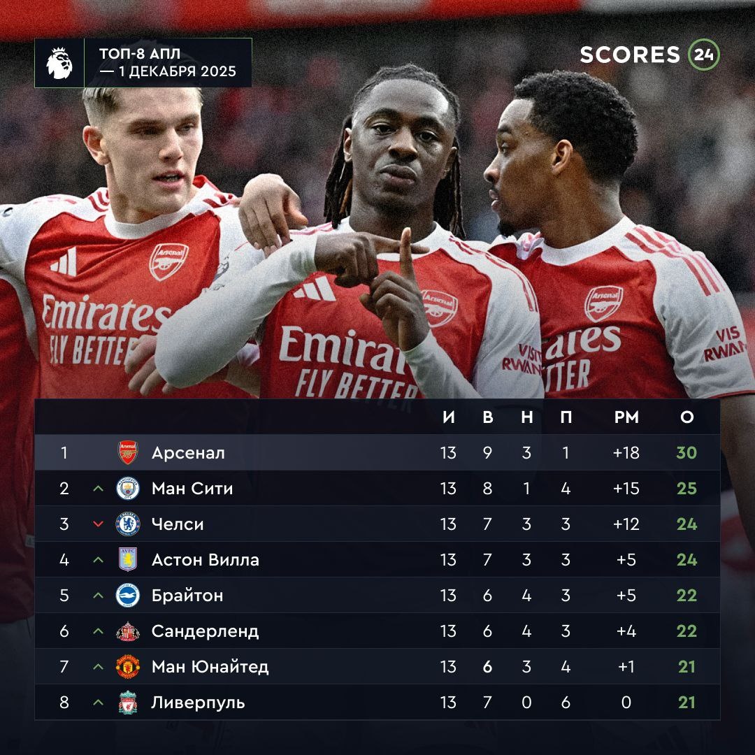 После минувшего тура Арсенал возглавляет турнирную таблицу Премьер-лиги с отрывом в 5 очков 🔝🏆 ⚡ Всего 4 очка отделяют 2-е место от 8-го, что делает борьбу за лидерство крайне напряженной. Сможет ли «Арсенал» наконец выиграть Премьер-лигу? 🏆 - да 👎 - нет