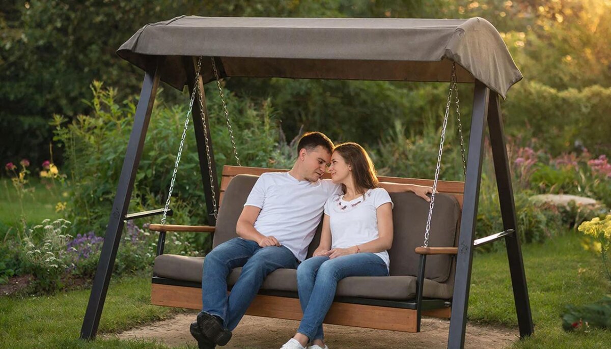 · садовые качели — Катя купила в садовом центре солидную конструкцию из дерева и металла: прочную скамейку на надёжных опорах с навесом от солнца. Вместе с Сергеем они установили качели в тени старой яблони;