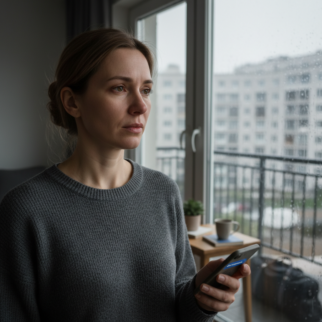 Дети были в школе. Дома стояла тишина. Вера села за стол, налила себе чай. Пила медленно, глядя в окно. За стеклом шёл дождь, серое небо низко нависало над городом.