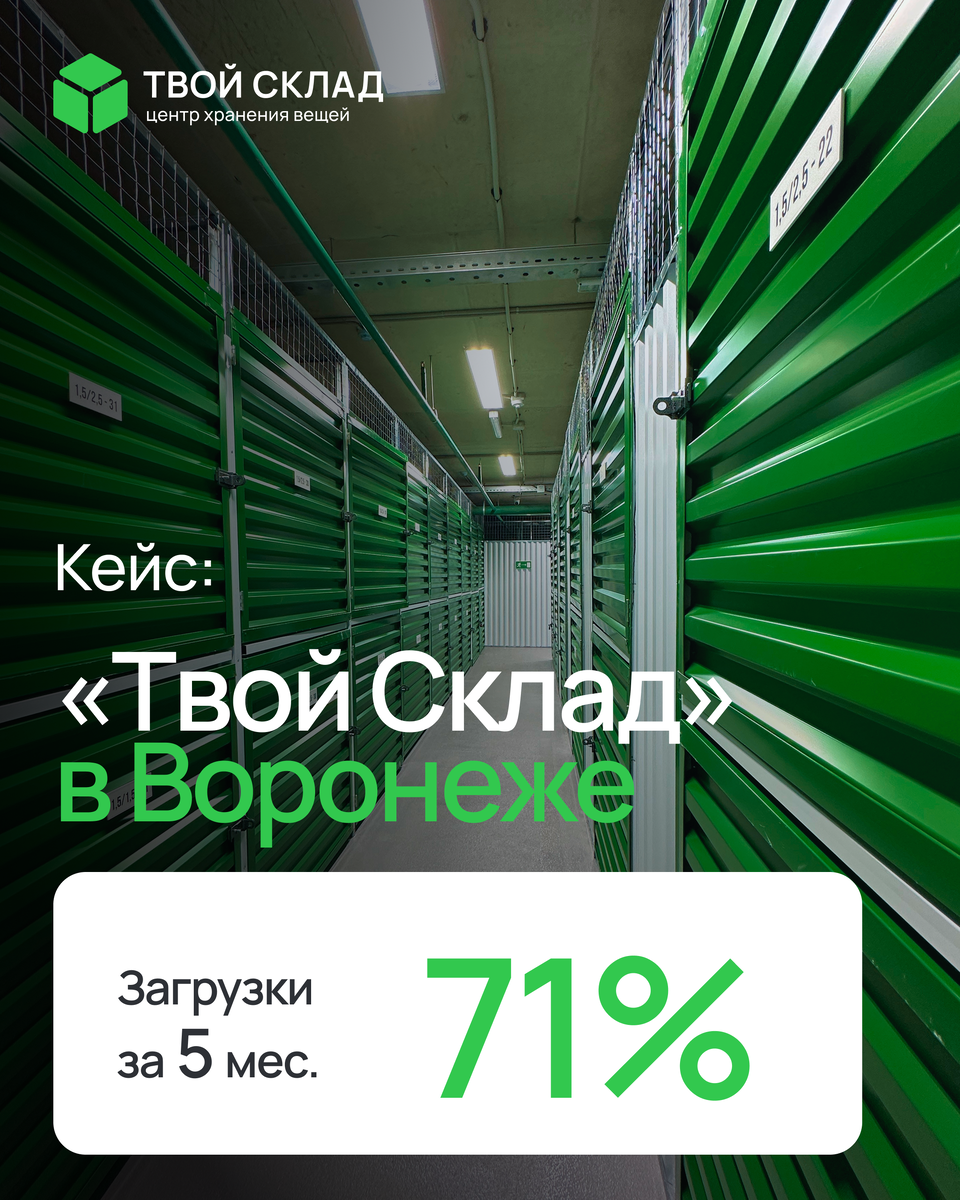 Всего два месяца понадобилось объекту федеральной сети «Твой Склад» в Воронеже, чтобы перевыполнить плановые показатели по загрузке. Такой результат стал одним из самых быстрых и успешных стартов в сети. Рассказываем, как это было достигнуто. О проекте: цифры и факты Уже на втором месяце работы объект превысил целевые показатели, а спустя пять месяцев фактическая загрузка в 71% уверенно опережает изначальный план в 47%. Формула быстрого успеха: три ключевых фактора. Анализ работы объекта позволяет выделить основные причины стремительного выхода на операционную эффективность: 1. Идеальная локация. Комплекс расположен в динамично развивающемся и активном районе города, что обеспечило постоянный поток потенциальных клиентов — как жителей окрестных домов, так и представителей малого бизнеса. 2. Комплексный маркетинг. С первого дня была запущена продуманная стратегия по продвижению, направленная на активное присутствие в информационном поле Воронежа. Это позволило быстро создать узнава