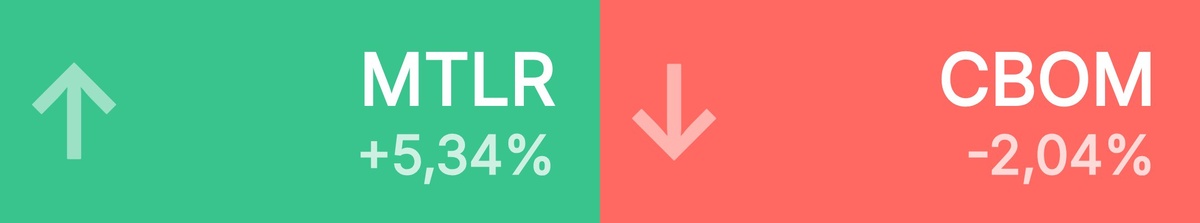 🔺 Топ-10 лидеров роста среди крупнейших акций: Мечел • 75,54 ₽ • 5,34% ЭсЭфАй • 1 678 ₽ • 3,67% ВИ.ру • 70,70 ₽ • 2,82% Циан • 698 ₽ • 2,41% ЮМГ • 755 ₽ • 2,35% НЛМК • 108 ₽ • 2,35% МТС • 217 ₽ • 2,24% Новатэк • 1 186 ₽ • 1,68% МТС Банк • 1 287 ₽ • 1,66% VK • 277 ₽ • 1,54% 🔻 Топ-10 лидеров падения среди крупнейших акций: Московский • 8,03 ₽ • -2,04% Ренессанс • 98,50 ₽ • -1,79% Совкомбанк • 12,75 ₽ • -1,24% НоваБев Гр • 429 ₽ • -1,20% Татнефть • 596 ₽ • -1,10% Фикс Прайс • 0,61 ₽ • -1,03% Астра • 272 ₽ • -0,91% Татнефть п • 556 ₽ • -0,87% Хэдхантер • 2 869 ₽ • -0,86% Медикал Гр • 1 343 ₽ • -0,70%