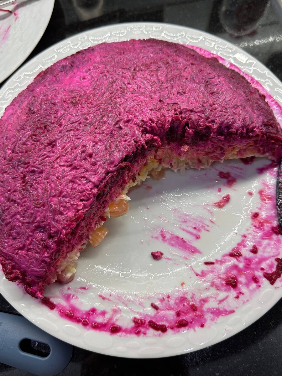 Продолжаем кулинарную тему, на выходных готовили салаты: селедку под шубой и куриный с грибами, сыром и яйцами