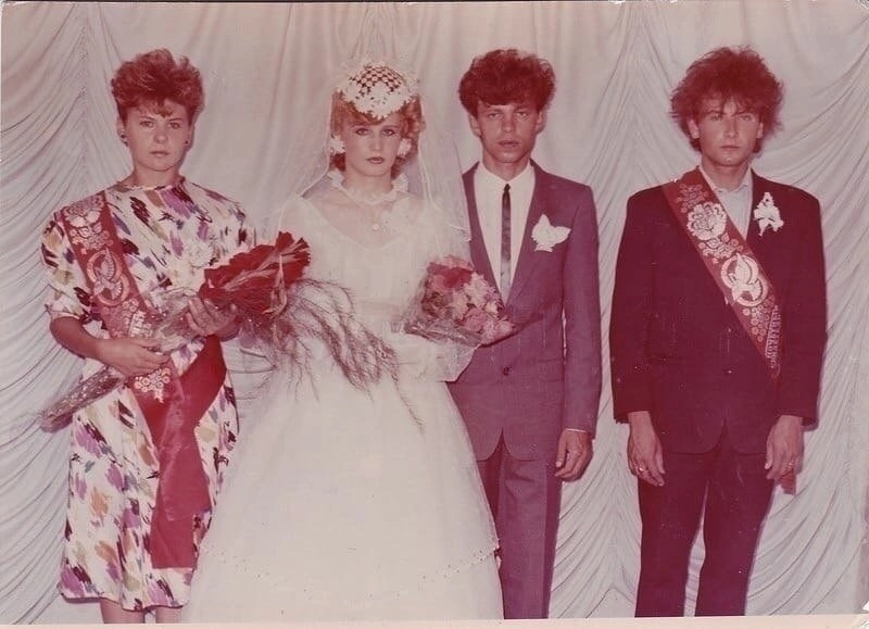Когда сегодня мы перелистываем пожелтевшие свадебные альбомы 90-х, нас охватывает смесь улыбки и ностальгии. Это были не просто торжества — это были яркие, шумные, порой безвкусные, но невероятно душевные манифесты эпохи. После распада СССР, на фоне дефицита и головокружительных перемен, свадьба стала тем праздником, где можно было «оторваться» по полной, выплеснув все мечты о новой, сытой и яркой жизни. Идеальная площадка для свадьбы 90-х — это местная столовка или ресторан, где под звуки кассетного магнитофона собирались толпы родни и друзей, часто приехавших из разных городов. Это было событие всеобщего масштаба. Декор не оставлял шанса пустоте: сотни воздушных шаров, диско-шар, мерцающий блёстками, самодельные плакаты и… загадочные логотипы западных брендов, чьё значение никто не понимал, но которые казались символом успеха. Платье невесты — отдельная поэма. Обязателен кринолин невероятных объёмов, фата до пола, длинные кружевные перчатки и множество аксессуаров: диадемы, искусстве