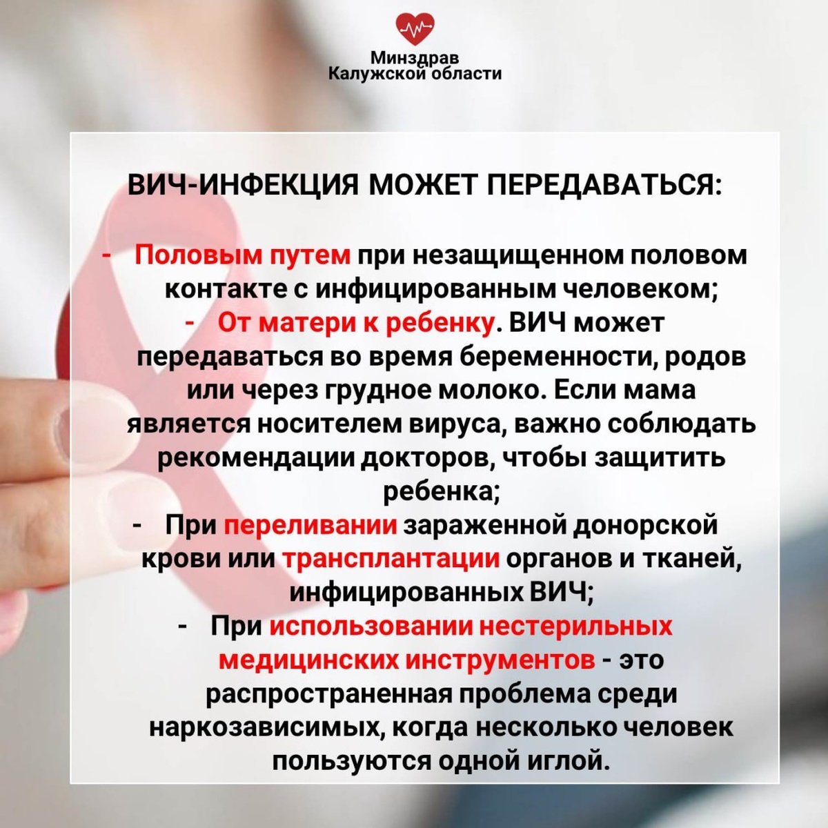 Ежегодно 1 декабря во всем мире отмечается Всемирный день борьбы со СПИДом. Часто люди, живущие с ВИЧ, даже не подозревают, что в их организме есть вирус. Симптомы ВИЧ очень не специфичны, долгое время заболевание протекает бессимптомно. Через 2-4 недели после попадания вируса в организм может возникнуть гриппоподобное состояние. Поэтому часто острая стадия остается незамеченной или ее принимают за ОРВИ. Начальный метод диагностики ВИЧ - анализ крови на антитела к вирусу иммунодефицита человека. Анализ можно сдать бесплатно в Центре лечения и профилактики ВИЧ-инфекции (Калуга, ул. Грабцевское шоссе, 115) или в поликлинике по месту жительства по направлению врача. Сегодня не существует способа, который бы мог полностью вылечить ВИЧ-инфекцию. Но при помощи антиретровирусной терапии можно прекратить размножение вируса и исключить его воздействие на иммунную систему. Сейчас люди с этой болезнью могут жить полноценно, не сталкиваясь с какими-либо ограничениями. Главное - принимать препар