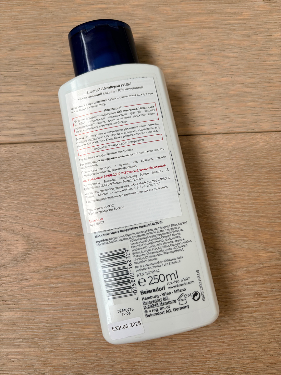 Отличная штука для увлажнения кожи- увлажняющий лосьон с 10% мочевиной Urea repair от бренда Eucerin, особенно в отопительный сезон. Один из моих любимчиков, кстати. Упаковка- отлично всё, средство находится в пластиковом белом флаконе с устойчивой откидывающейся крышкой, на которую можно поставить его и благодаря консистенции его можно использовать до последней капли. Крышка защелкивается, ничего не протечет. Дизайн по стилю аптечный,приятный. Имеется наклейка на русском языке. Объем 250 мл. Консистенция-молочко белого цвета почти без запаха, ну почти. Очень быстро распределяется по коже, моментально ее увлажняя и оставляя защитный барьер, но это не жирная липкая пленка. Я наношу сразу после душа, рекомендую наносить именно на влажную кожу и немного. Очень комфортно с ним, кожа нежная, мягкая, приятная на ощупь. Очень универсальное средство-можно мазаться всей семьей. Есть накопительный эффект, чем больше мажешься-тем лучше выглядит и чувствует себя кожа, проходит зуд, шелушения,