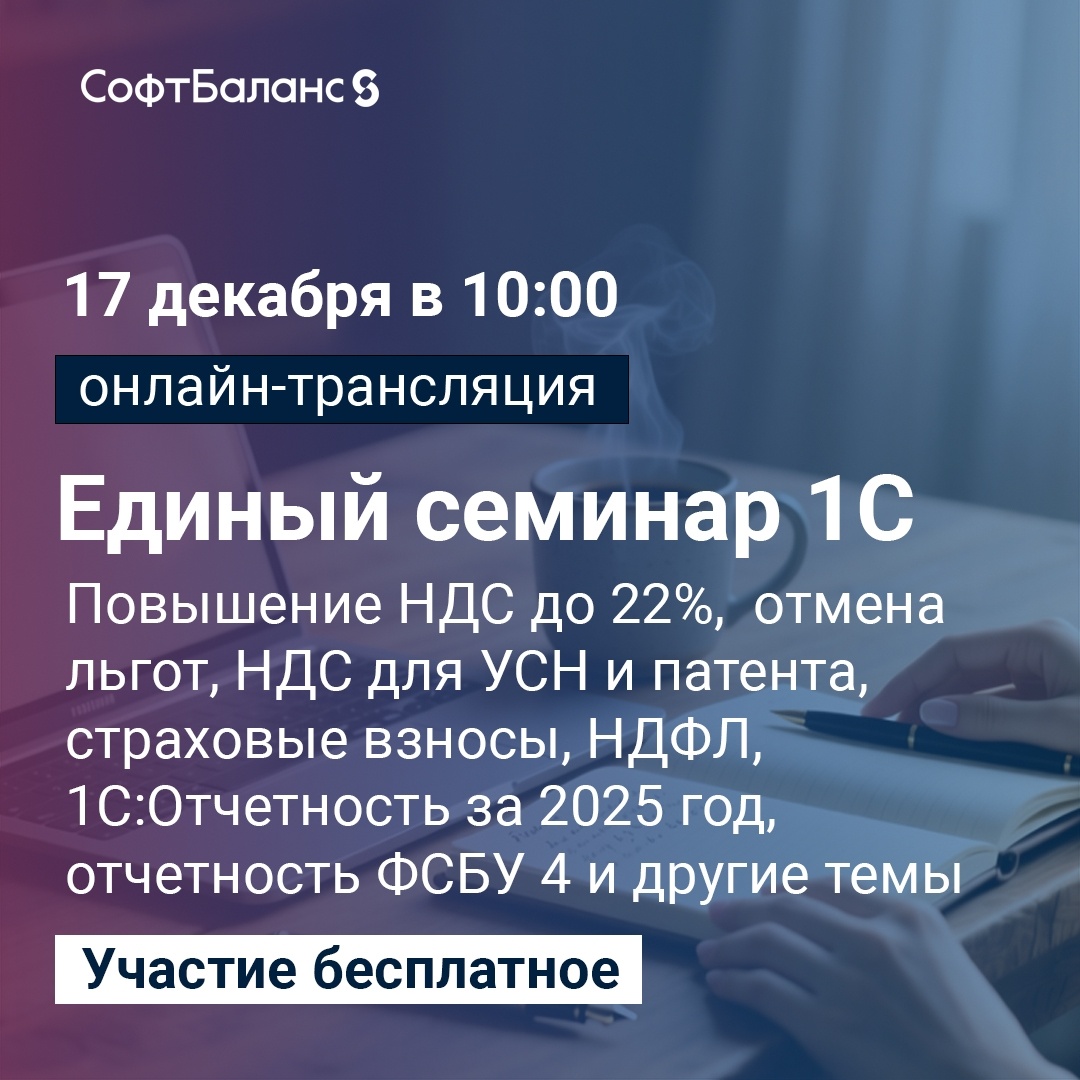 Фирма "1С" и группа компаний "СофтБаланс" приглашают принять участие в Едином семинаре 1С, который пройдет 17 декабря 2025 года (среда) в 10:00 в формате онлайн-трансляции. На Едином онлайн-семинаре выступят ведущие специалисты ФНС, фирмы "1С" и ГК "СофтБаланс". В заключительной части мероприятия в виртуальном зале ГК "СофтБаланс" пройдет розыгрыш призов, о котором мы сообщим дополнительно. Семинар бесплатный, обязательна регистрация по ссылке