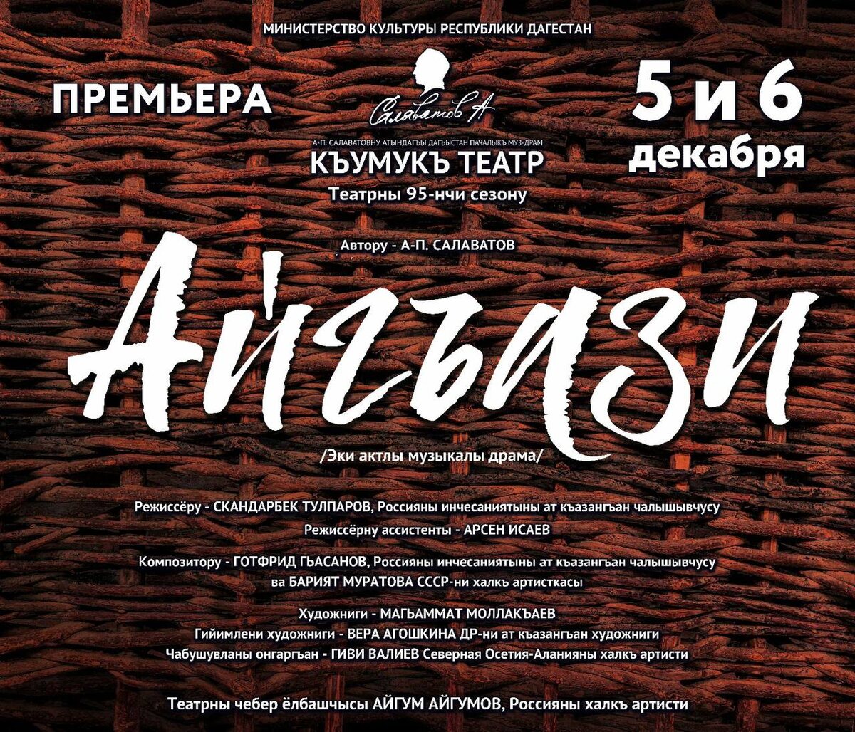 Къумукъ театрны прес-къуллугъу билдиреген кюйде, 5-нчи ва 6-нчы декабрде А-П.Салаватовну "Айгъази" деген пьесасына гёре салынгъан спектакль